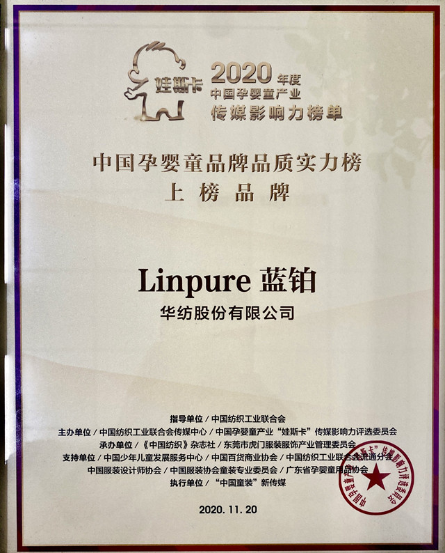 日前,公司Linpure藍鉑品牌既獲“娃斯卡”2019年度中國孕嬰童品牌暖心實力榜后,再獲中國孕嬰童產業“娃斯卡”傳媒影響力評選委員會頒發的2020年度中國孕嬰童品牌品質實力大獎。