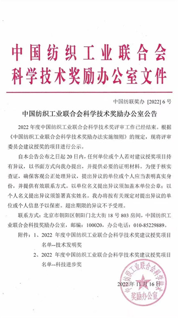 公司一項(xiàng)技術(shù)進(jìn)步成果獲得全國(guó)紡織科技獎(jiǎng)