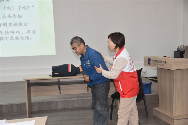 培訓(xùn)課上,王燕老師首先介紹了紅十字運(yùn)動(dòng)的基本知識(shí),隨后重點(diǎn)針對(duì)日常生活中較為常見的意外事故,向在場(chǎng)員工詳細(xì)講解,并演示了創(chuàng)傷救護(hù)、氣道異物梗阻急救、海姆立克急救法、心肺復(fù)蘇及包扎固定等急救技能和相關(guān)知識(shí)。