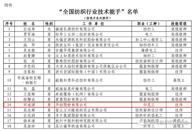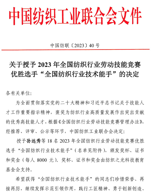 導讀:近日,中國紡織工業聯合會發布了授予在2023年全國紡織行業勞動技能競賽中取得前18名的紡織企業員工為“全國紡織行業技術能手”榮譽稱號的決定,