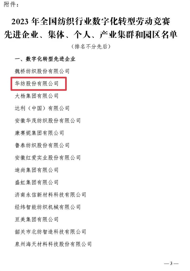 導讀:近日,中國紡織工業聯合會、中國財貿輕紡煙草工會全國委員會聯合發布了《關于2023年全國紡織行業數字化轉型勞動競賽結果的通報》,