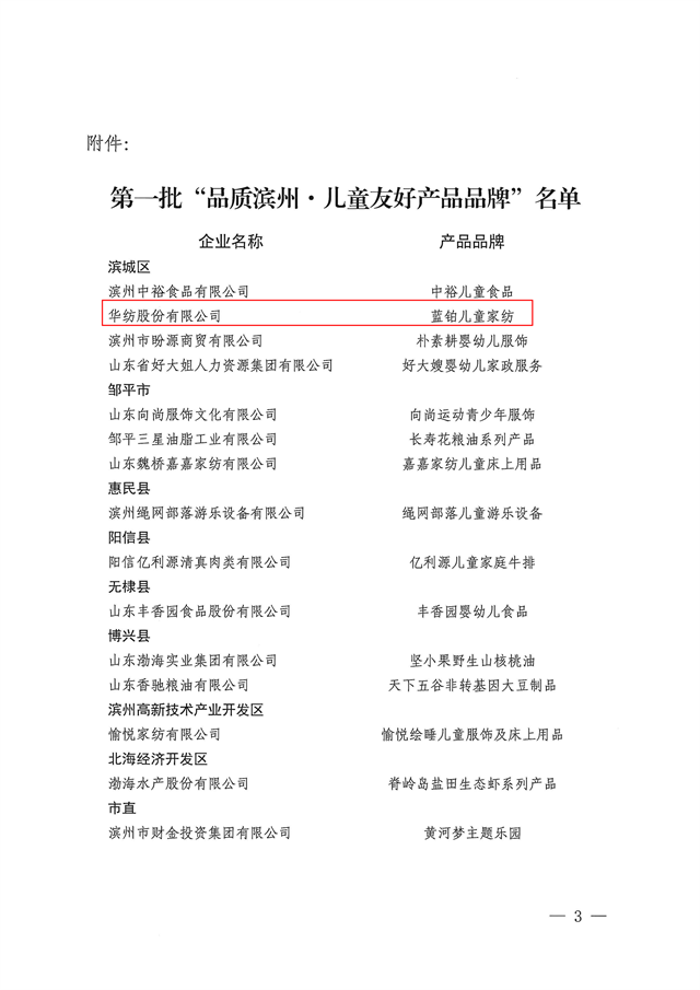 近日,市發(fā)展改革委、市婦聯(lián)、市市場監(jiān)管局聯(lián)合發(fā)布第一批“品質(zhì)濱州·兒童友好產(chǎn)品品牌”名單,公司藍(lán)鉑兒童家紡憑借卓越的品質(zhì)與貼心的設(shè)計(jì)成功入選。
