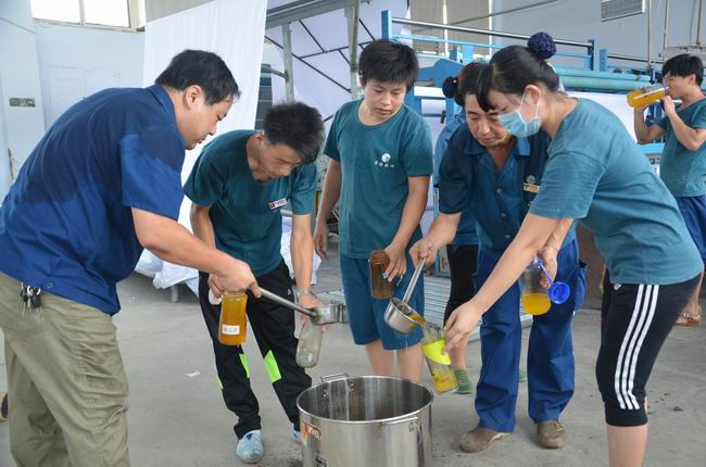 7月29日,當日濱州市溫度高達35℃,華紡股份有限公司管理者將冰好的橘子粉化制飲品到一線生產崗位,一一分發到正在當班的員工水杯中,緩解高溫為員工帶來的酷熱,送上一份清涼和關愛。