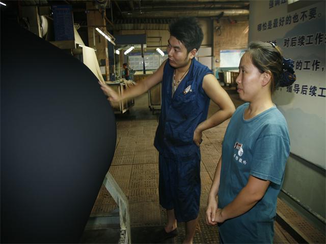 圖為面三車間丙班2#拉幅機擋車工李良(左)與出檢工崔月華,在查看產品質量。
