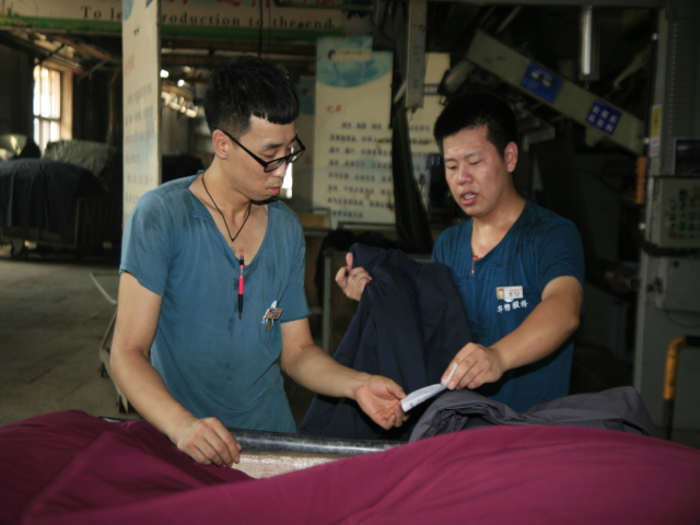 面三車間陳萬龍(圖右)在與本車間后處理預縮機機長王巖軍核對完試驗布數據后,說:“氣溫高,我們的勞動熱情更高!”