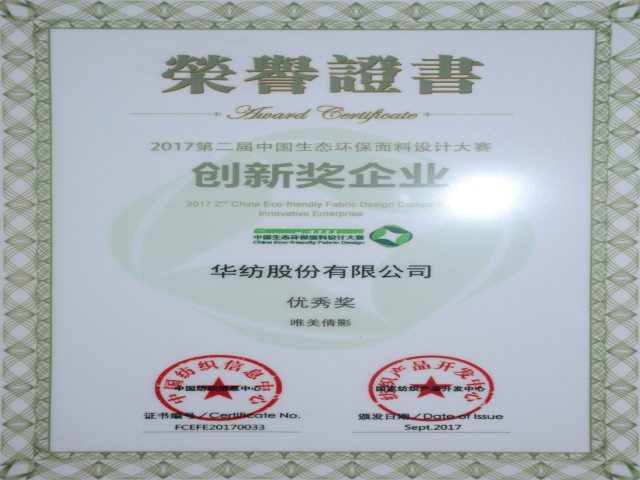 在參評的設計作品方面,由公司員工席亞偉設計開發的“風飄絮”、孟鑫設計的“Strange Camouflage”產品,榮獲“2018/2019秋冬中國流行面料入圍評審優秀獎”;孟鑫設計的“唯美倩影”作品,榮獲“2017第二屆中國生態環保面料設計大賽優秀獎”。