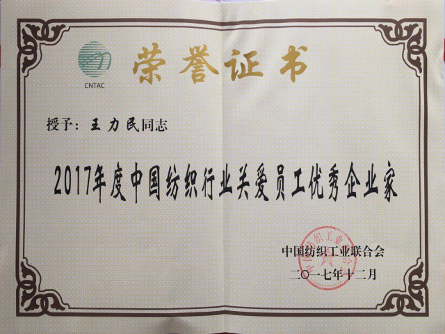 日前,中國紡織工業(yè)聯(lián)合會(huì)2017年人才工作大會(huì)在濟(jì)南召開,會(huì)上表彰了人才建設(shè)工作先進(jìn)單位和個(gè)人。公司以在人才機(jī)制建設(shè)、人才培育成長等方面的良好成效,榮獲“2017年度中國紡織行業(yè)人才成長最佳企業(yè)”稱號(hào);公司黨委書記、董事長王力民以對廣大員工及各類人才的關(guān)愛情懷,榮獲“2017年度中國紡織行業(yè)關(guān)愛員工優(yōu)秀企業(yè)家”稱號(hào)。