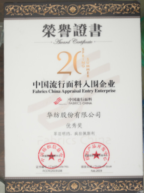 導讀:在剛剛結束的2019中國國際面料設計大賽、第41屆(2020春夏)中國流行面料入圍評審活動中,公司榮獲“2020春夏中國流行面料入圍企業”稱號。